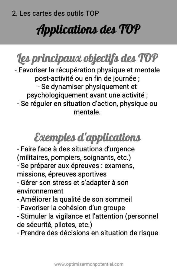 Les TOP interviennent au niveau de l'Ă©valuation cognitive que le sujet fait de lui-mĂȘme et de la situation. Elles permettent de renforcer les mĂ©canismes physiologiques, psychologiques et comportementaux d'adaptation Ă toute situation de stress en favorisant le stress adaptĂ©. Elles aident les sujets Ă rĂ©guler leur Ă©nergie afin qu'ils puissent utiliser au mieux leur potentiel.