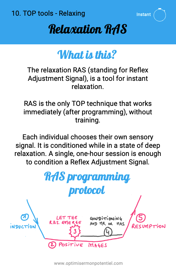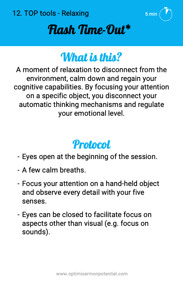 The protocol starts with a few calm breaths that prepare the nervous system. Close your eyes and check your TOP weather forecast to assess your condition. Follow up with an R3P type of relaxation adapted to the short duration.